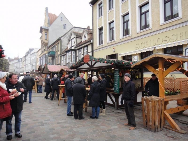 Det var en kold, våd og mørk decemberdag, da vi kørte turen fra Danmark på vej på julemarked i Schwerin. Vi blev vel modtaget på hotellet og tog hurtigt herefter lokalbussen ind til centrum, og her bliver vi mødt af en behagelig duft af tysk julemarked. I den gamle bydel er gaderne gjort bilfri. Fra et utal af boder tilbydes alt, hvad øjet, hjertet og maven kan begære. Det er først og fremmest duften af pølser af alle mulige størrelser – mest de store – der er lagt på glødende kul og ”glühwein” i store kedler, der fortæller, at her er et rigtigt tysk julemarked i gang. Vi må naturligvis varme os med ”glühwein”, mens vi går på ”kig” fra bod til bod. Var det noget med en stegt pølse, der vejer et halvt kilo, en banan i chokoladeovertræk, ægte lækkert lamastrik fra Peru, eller traditionel tysk træarbejde med julemotiver Erzgebirge eller havtornlikør fra Rügen? Der er noget for enhver smag - også den danske. Dejligt at se, at der ikke er gået ”Kina” i udbuddet. Til gengæld er der karruseller for de små og et stort flot pariserhjul, der i mørket skifter farve, for de lidt større. Til den dekorative af sagen har man skabt flotte udstillinger med julekrybben og kendte eventyr.